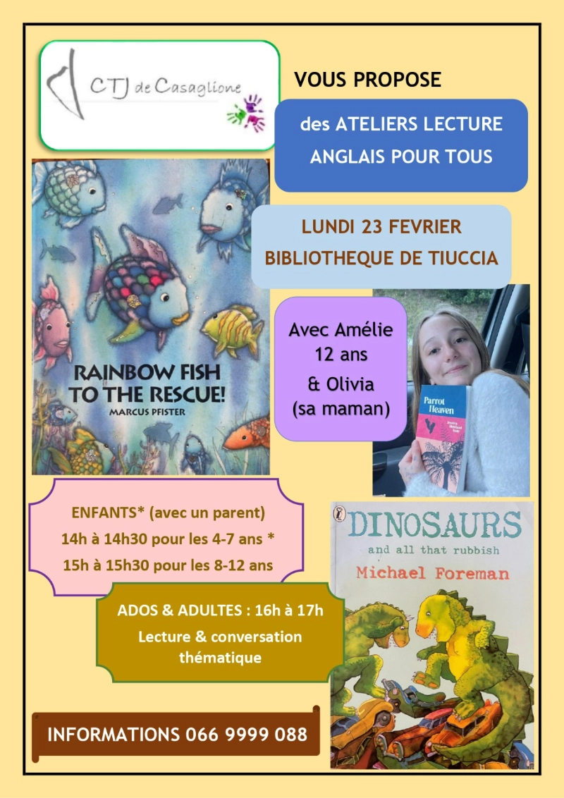 Atelier de lecture en Anglais Dans le cadre du CTJ de Casaglione, Amélie et sa maman Olivia vous proposent lundi 23 février un atelier de lecture en Anglais. Pour plus de renseignements, cliquez sur le programme ci-contre !