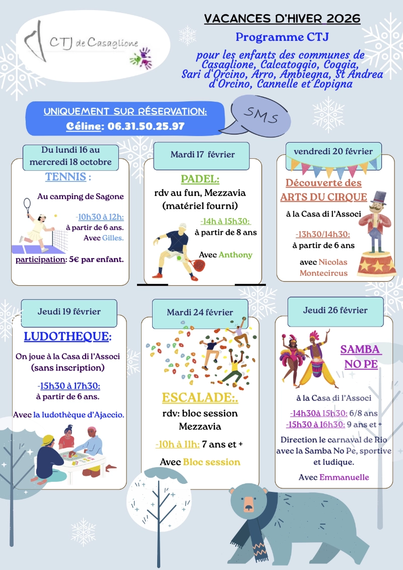 La C.T.J., Convention Territoriale Jeunesse, est un partenariat entre la Collectivité de Corse, l’Académie de Corse, la CAF et la Mairie de Casaglione pour des activités enfants/jeunes.