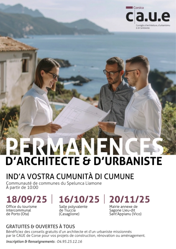 Permanence d’architecte & d’urbaniste Cette permanence est gratuite et ouverte à tous, notamment à Tiuccia le 16 octobre prochain à partir de 10H00. Tous les détails, renseignements et inscription, en cliquant sur l’affiche ci-contre !