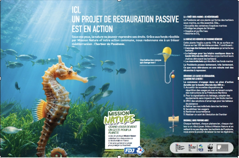 Depuis octobre 2023, MISSION NATURE, le jeu à gratter de la Française des Jeux (FDJ) lancé en partenariat avec l’Office français de la biodiversité (OFB), donne la possibilité de soutenir des projets concrets et ambitieux de restauration de la biodiversité. C’est dans le cadre MISSION NATURE que le projet du WWF France, de restauration des herbiers de posidonie, a été retenu. Soutenu par l’OFB, le projet permet notamment d’appuyer des collectivités locales comme la commune de Casaglione qui participe depuis 2024 à travers des actions sur son territoire.