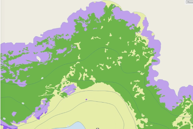 Cartographie des herbiers de posidonie sur la commune, les trous observé dans l’étendue verte représentant les herbiers peuvent s’expliquer par les corps morts utilisés pour le mouillage des navires et l’ancrage.